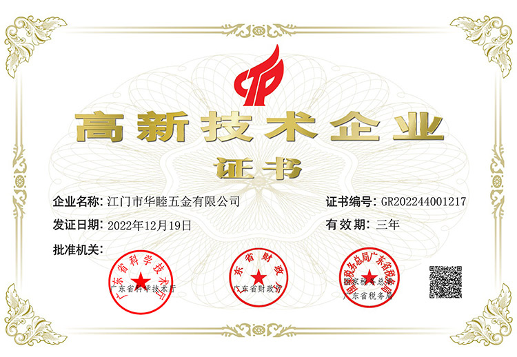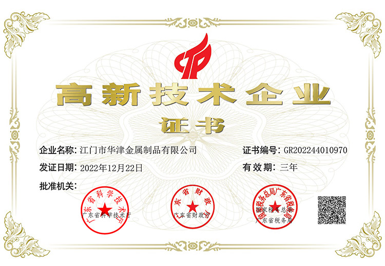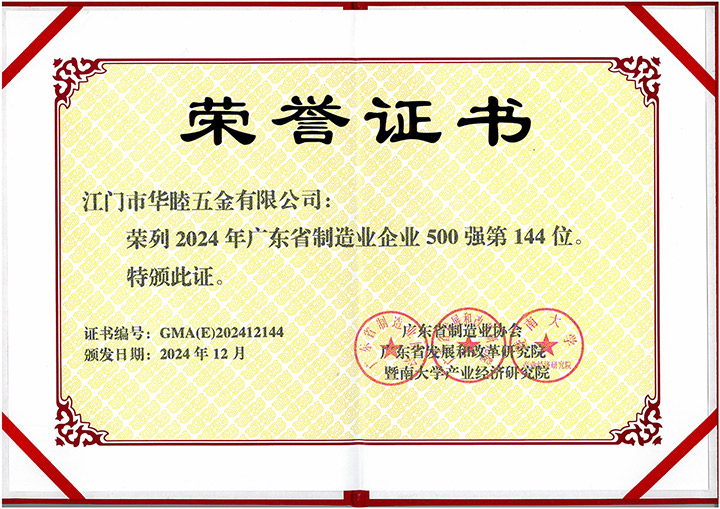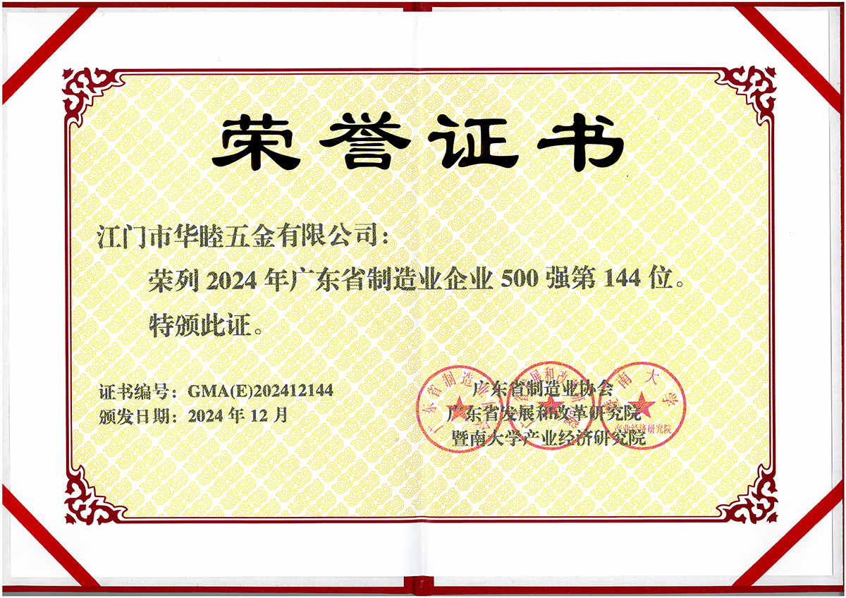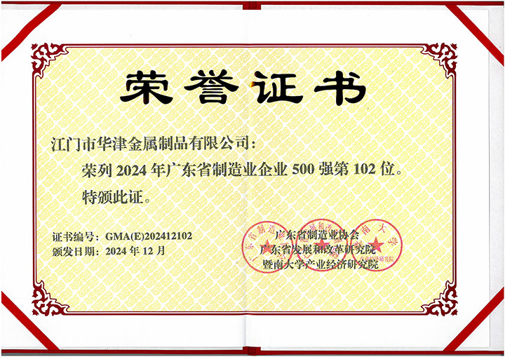 集團創建以來,社會各界對華津的企業發展給予了充分的肯定和高度的評價。華津榮列2024年廣東省制造業企業500強第102位,華睦榮列2024年廣東省制造業企業500強第144位,并且先后榮獲:國家高新技術企業、廣東省工程技術研究中心、廣東省名牌產品、江門市工程技術研究中心、標準化工作AAA級企業、江門企業百強等稱號。