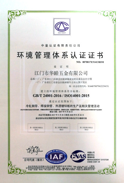 2017年9月,本公司之公司江門華津金屬制品有限公司(以下簡稱“華津”)及江門市華睦五金有限公司(以下簡稱“華睦”)分別收到由中鑒認證有限責任公司所頒發的《環境管理體系認證證書》(證書編號分別為:0070017E51407R0M號及0070017E51413R0M號)。