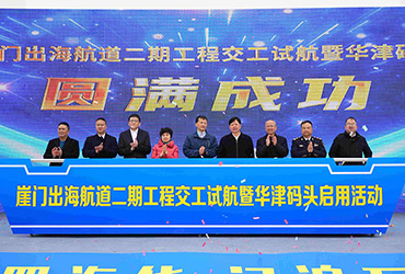 “江通四海貨?門(mén)泊萬(wàn)噸船”崖門(mén)出海航道二期工程交工試航暨華津碼頭啟用